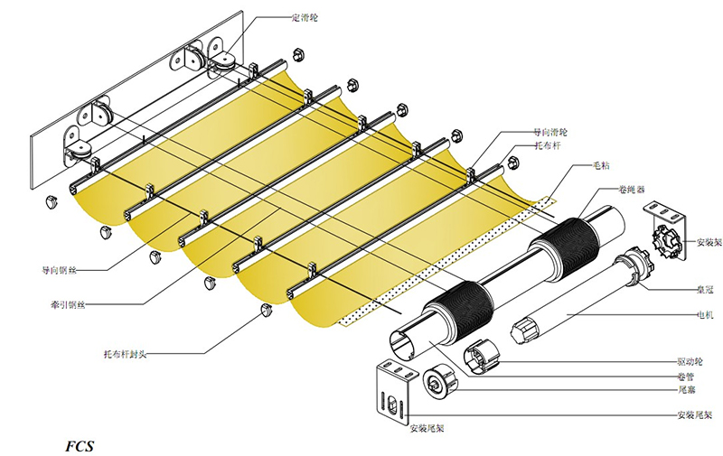 【系統配套】:FCS天棚簾系統卷管一般使用直徑為65mm或85mm的帶槽圓管,支架選用高強度鍍鋅鋼板,卷繩器為尼龍66材質。